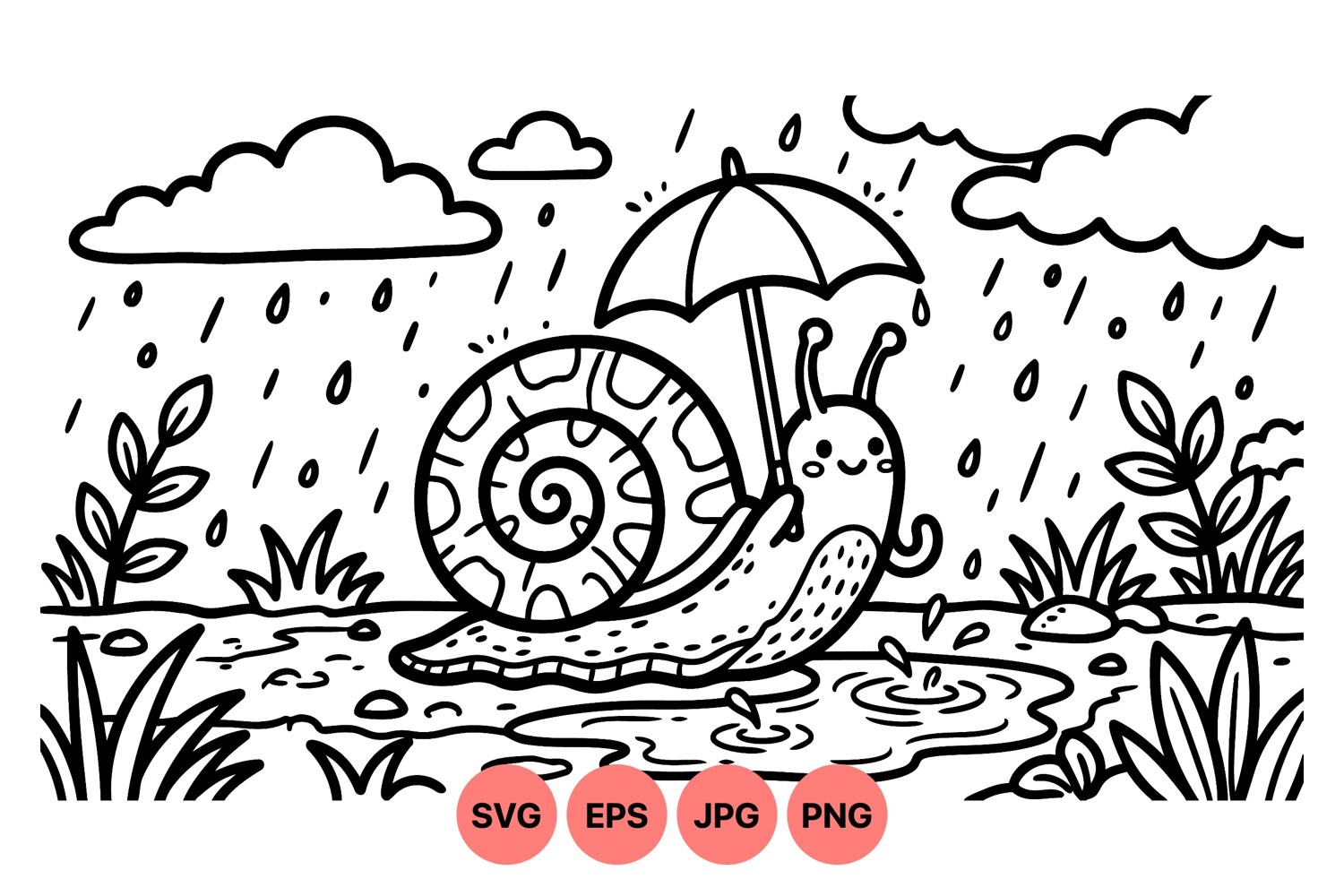 A cute smiling snail carries an umbrella walking through a rainy puddle surrounded by plants and clouds depicted in simple black line art style, charming and playful.