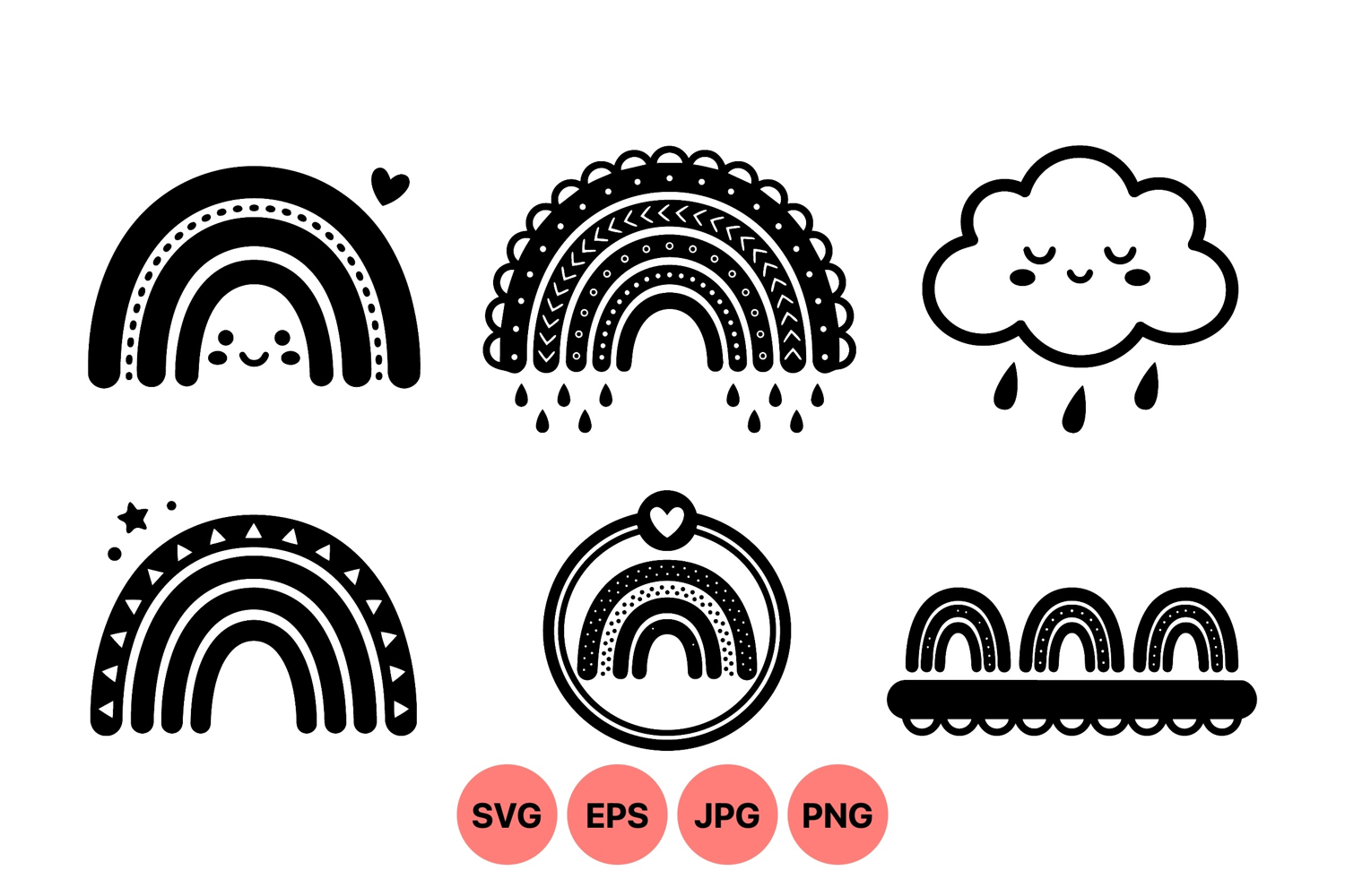 Hand drawn black and white smiling rainbows with decorative patterns hearts and stars accompanied by a sleeping cloud with raindrops in simple minimalist vector art style.