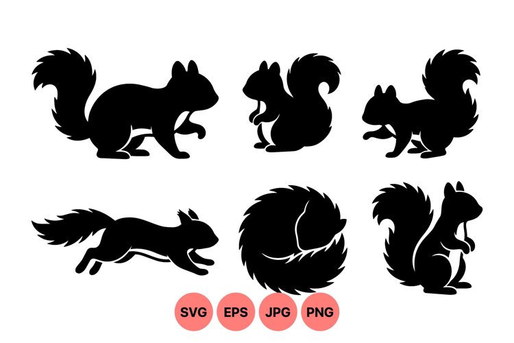 Solid black squirrel silhouettes in different positions including standing running and curled designs displayed as vector icons suitable for wildlife design projects with simple style