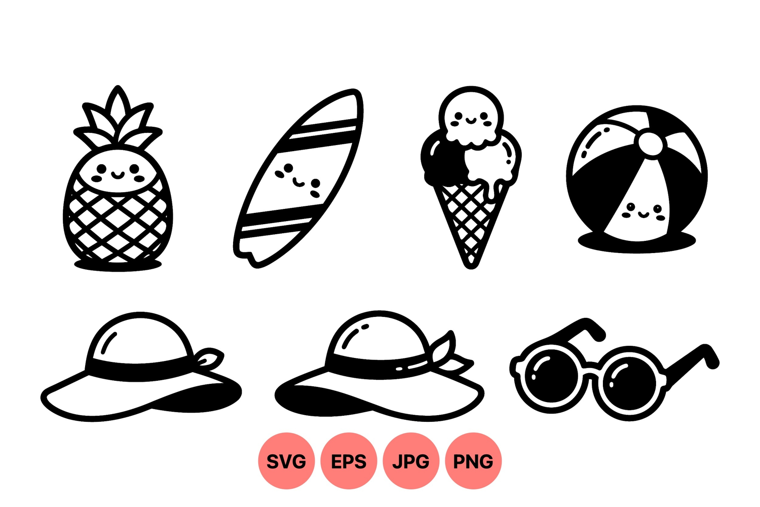 Black and white kawaii summer icons show smiling pineapple surfboard ice cream cone beach ball sun hats and round sunglasses in a playful flat vector art style perfect for summer themed designs.