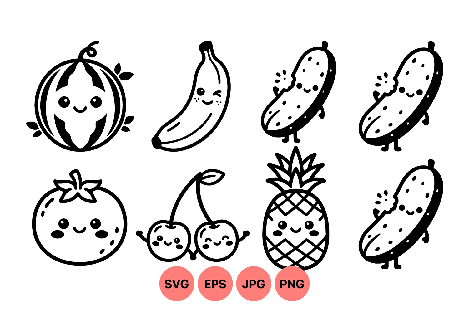 Vector showing adorable kawaii fruit and vegetable characters with smiling faces including watermelon banana pickle tomato cherries and pineapple in playful cartoon style cheerful mood