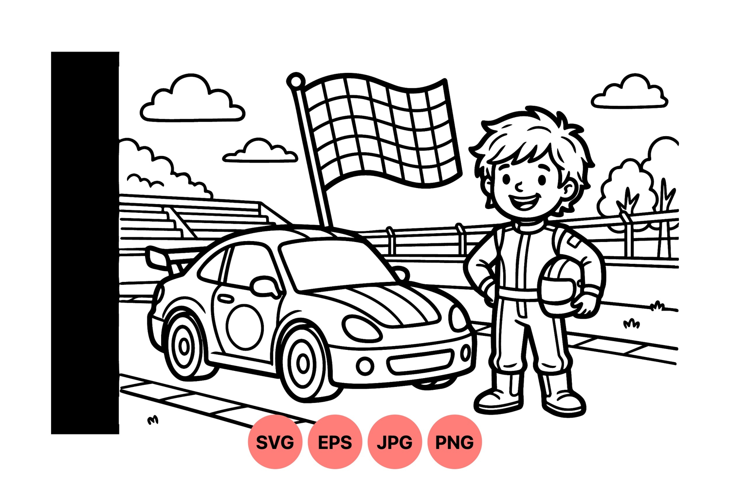 A cheerful boy in a racing suit holds a helmet and smiles beside a sporty race car with stripes and a checkered flag on a racing track, drawn in friendly cartoon style.