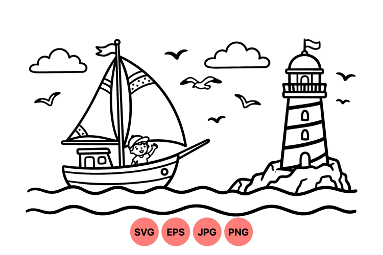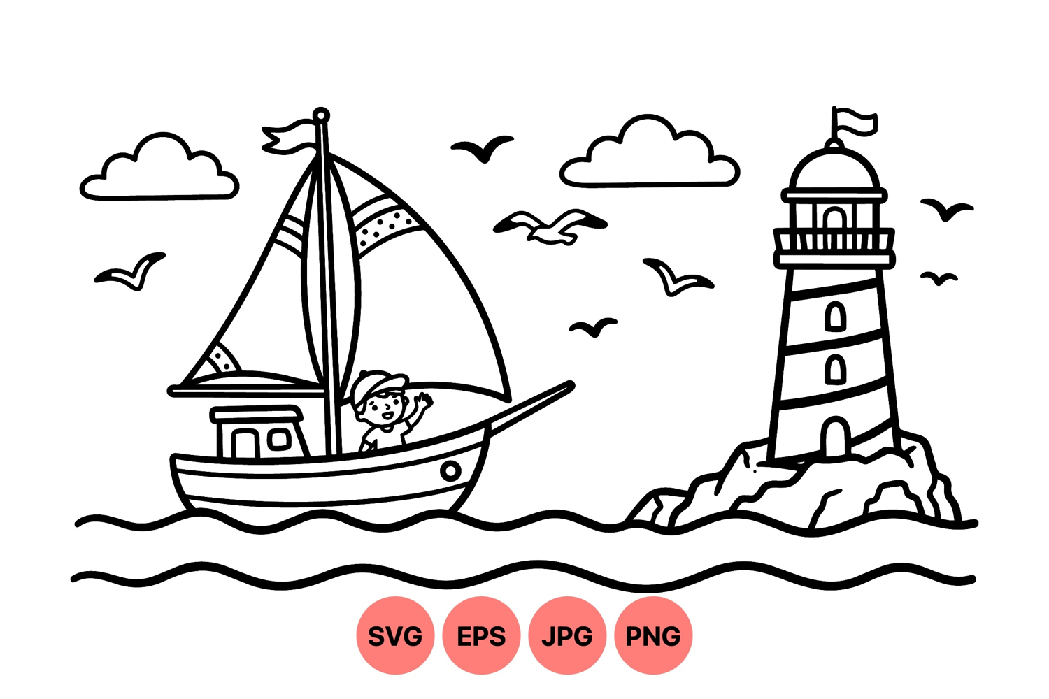 A simple black and white vector line drawing showing a sailing boat with a boy waving near a striped lighthouse on rocky shore with flying seagulls and floating clouds peaceful calm scene