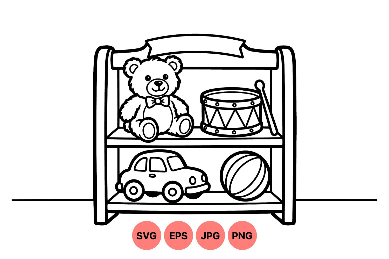 A clean line drawing displays a children toy shelf with a teddy bear wearing bow tie next to a drum with stick and a car alongside a ball on the lower shelf simple black and white friendly illustration
