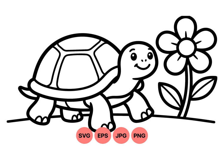 A charming line art vector of a smiling turtle walking beside a flower on the grass depicts nature and animal life with a clean black and white minimalist style, playful and friendly mood.