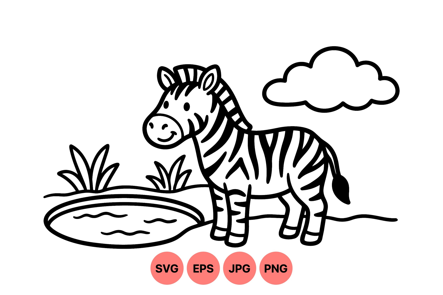A charming black and white flat design of a smiling zebra near a small pond with simple grass and cloud outlines in a playful vector style suitable for kids projects and educational materials.