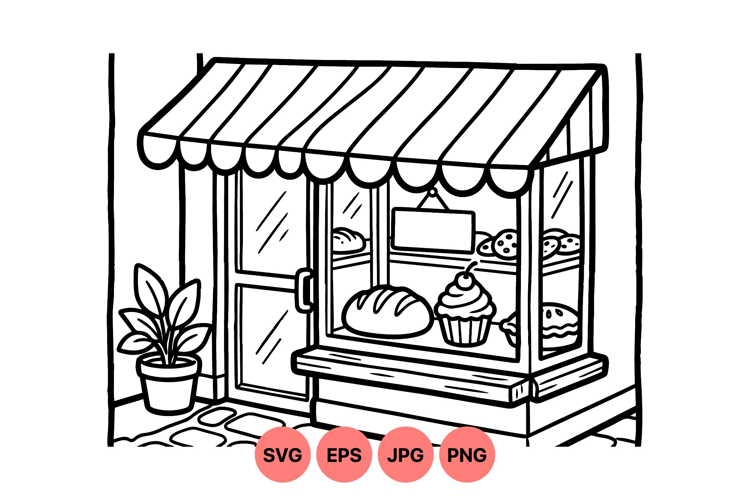 Simple black and white line art depicts a bakery shop with shelves of bread cupcakes and cookies beside a potted plant on tiled pavement in a minimalist vector style suitable for coloring pages peaceful.