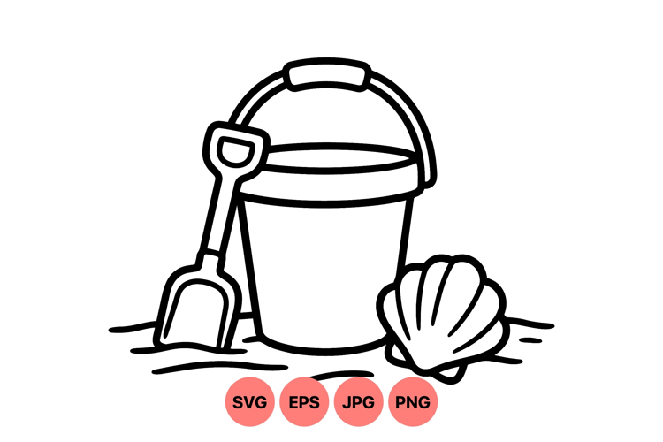 Clean black and white line art illustration of a bucket and shovel resting on sand alongside a seashell capturing a minimalist beach scene in vector format