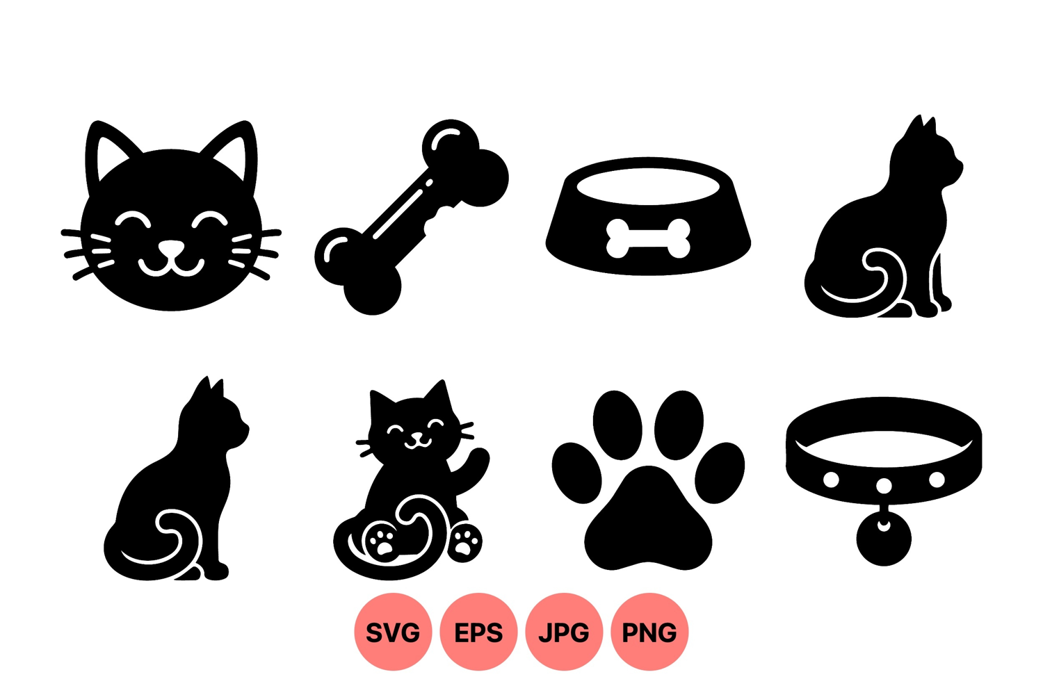 Cat Silhouette Clipart Playful Cat Graphic Happy Cat Illustration Animal Food Bowl Cat Sitting Vector Pet Accessory Clipart Pet Paw Print Icons Dog Bone Vector Art Cat Collar Design Cute Kitten Cartoon