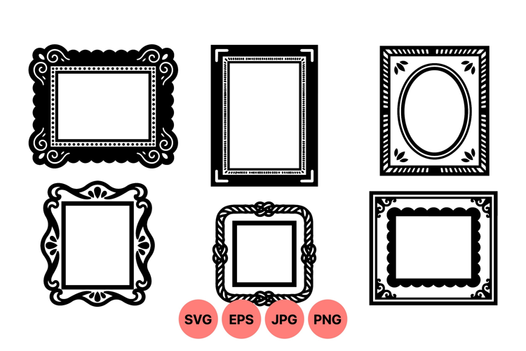 A of six vintage vector frames featuring ornamental and decorative border designs with elegant curves and patterns in black silhouette style for design projects or decoration purposes