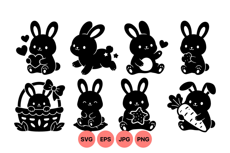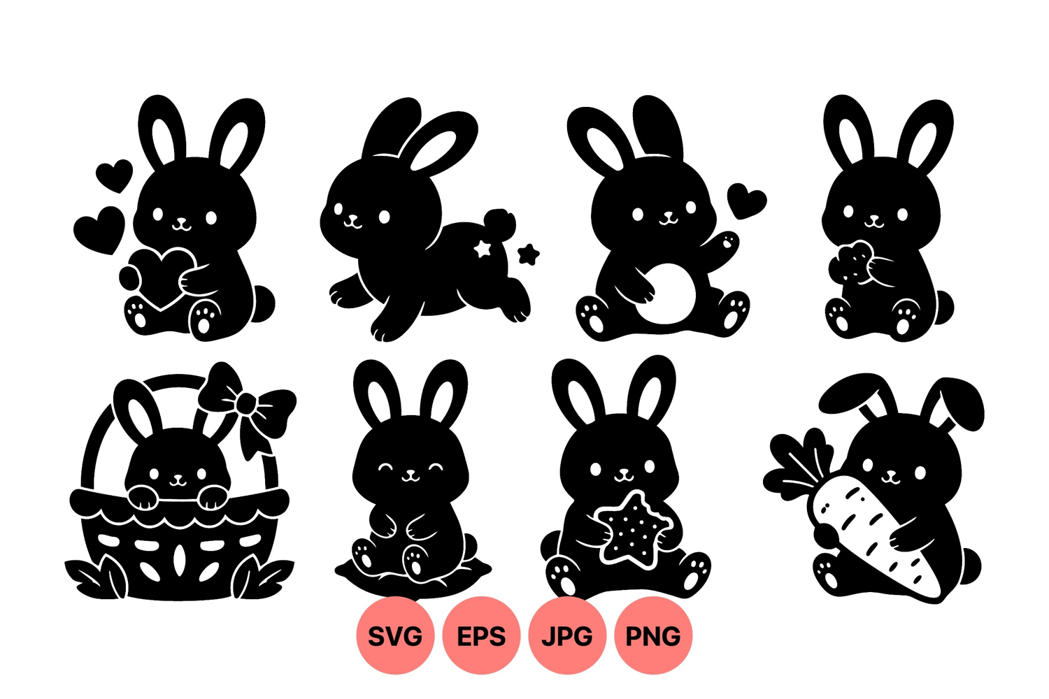Black silhouette bunnies show playful poses hugging heart star carrot and sitting in basket with bow in a flat vector style suitable for kids decor or greeting cards friendly mood