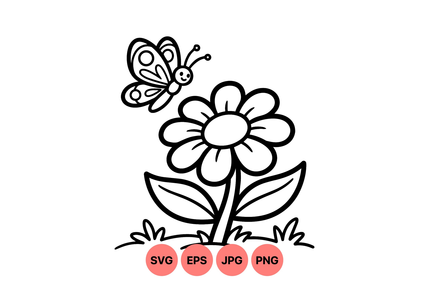 Simple black and white vector line art depicting a happy butterfly flying next to a flower with multiple petals and large leaves above grass, designed for coloring books or educational materials.