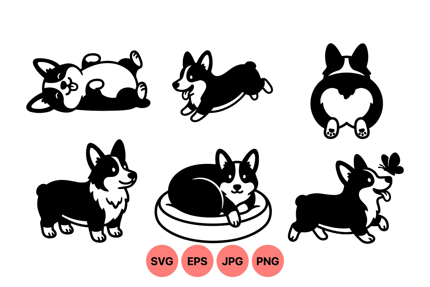 Adorable black and white corgi dogs are depicted in playful poses such as lying on back running and sitting with a butterfly capturing charming and lively moods in vector black and white style