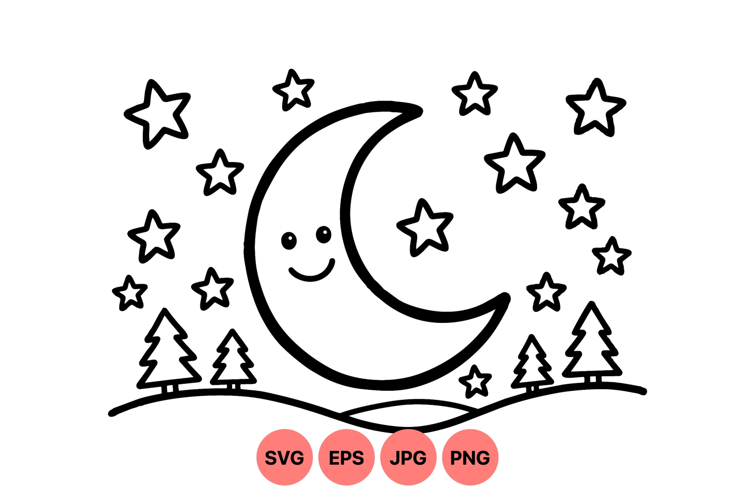 Black And White Line Night Sky Illustration Pine Trees Silhouette Printable Kids Art Starry Night Design Digital Craft Design Smiling Moon Svg Cute Moon Drawing Children Decor Graphic Peaceful Night Scene