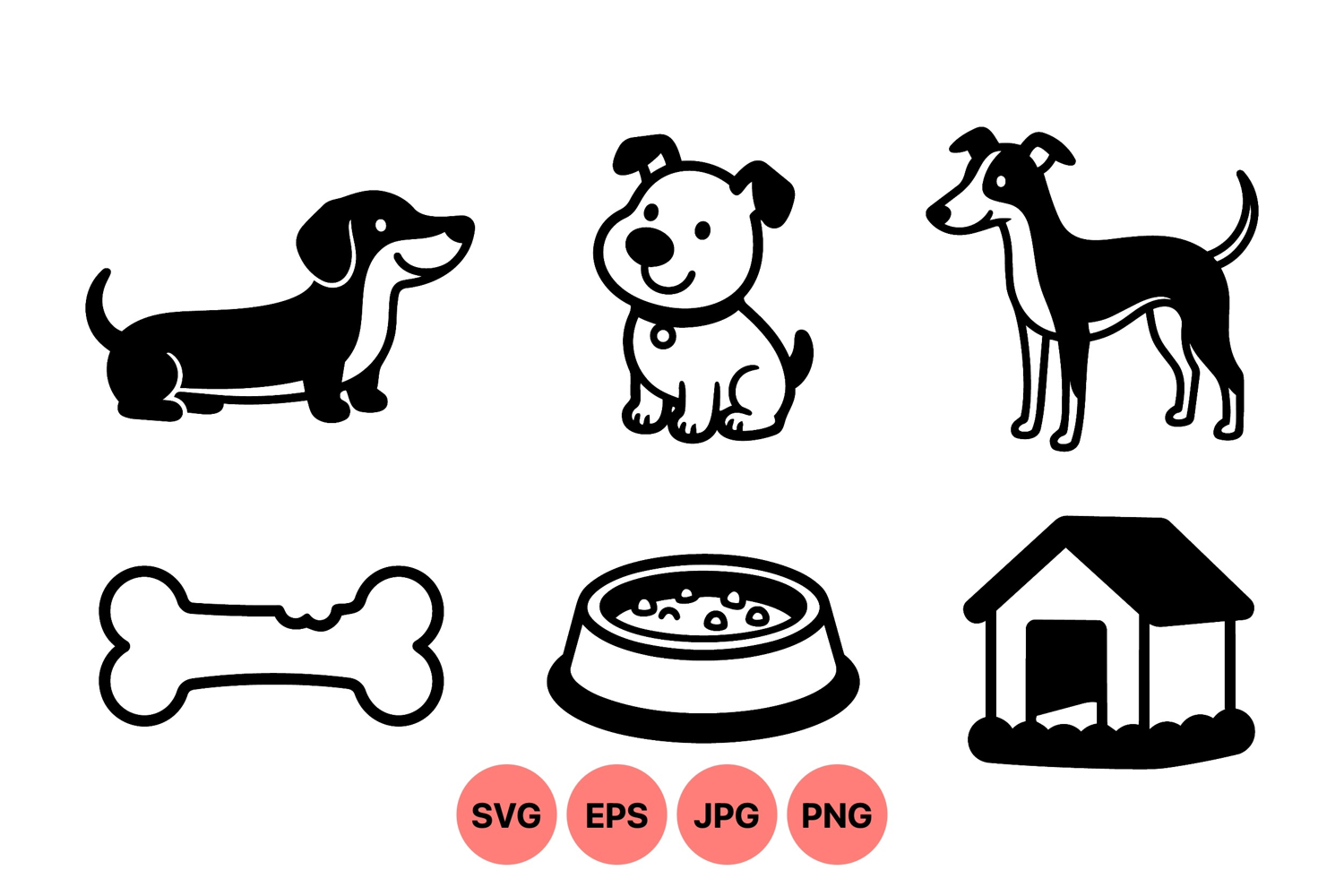Black And White Dog Dog Food Bowl Clipart Dog Bone Illustration Dog Silhouette Vector Dog House Graphic Simple Dog Drawing Friendly Pet Design Puppy Clipart Design Pet Accessory Icons