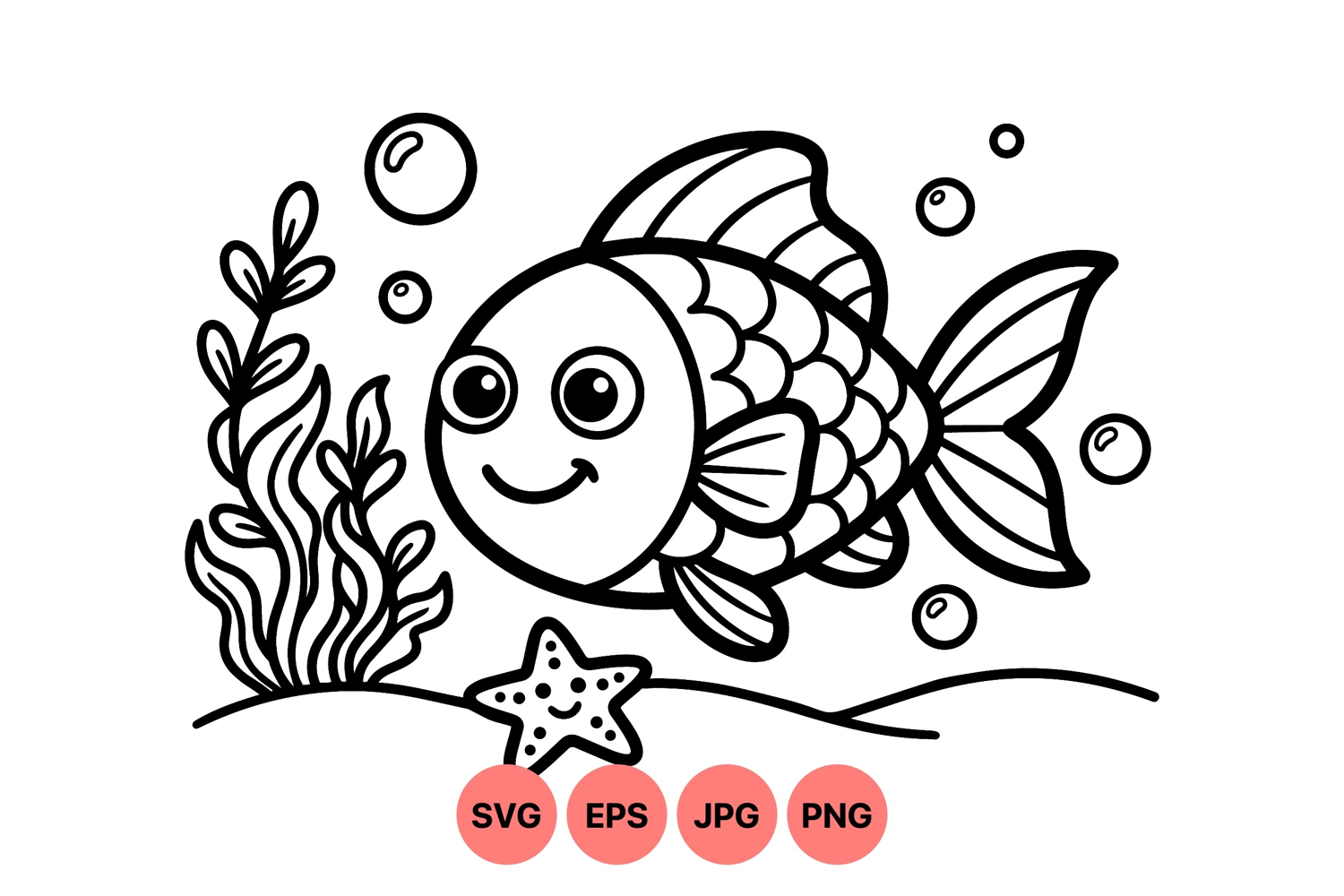 A cheerful cartoon fish swims underwater surrounded by seaweed starfish and air bubbles in black and white line art style suitable for coloring pages or educational uses joyful and playful