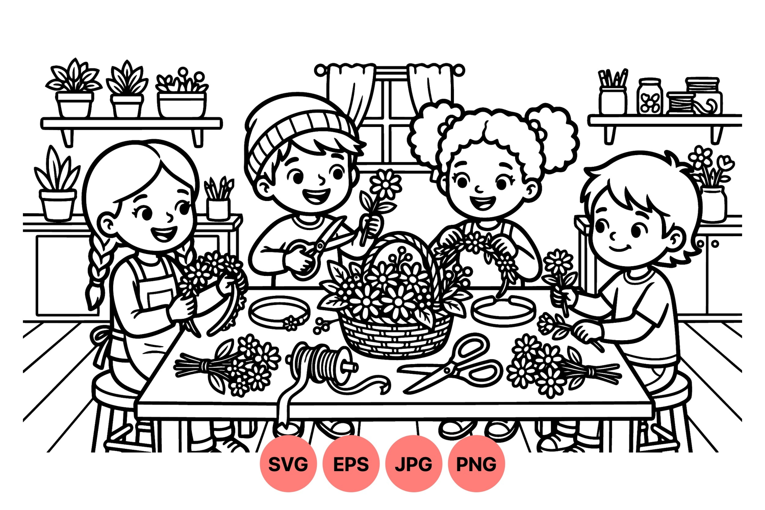 Children gather around a table indoors crafting flower wreaths using scissors and flowers in a flat black and white vector style suitable for educational or activity illustrations