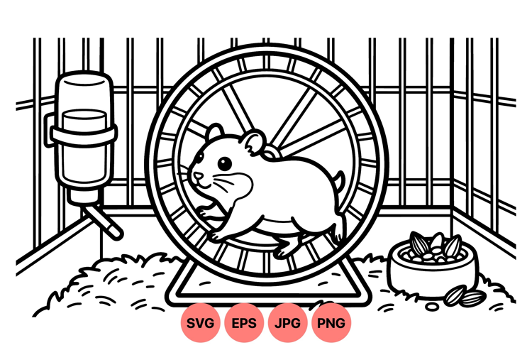 A cute hamster runs inside a wheel with a water bottle and food bowl nearby inside a cage. black and white line art vector suitable for children books and pet care guides.