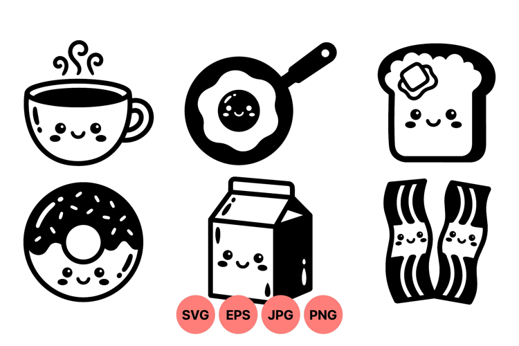 A kawaii style of smiling breakfast food icons including coffee cup, fried egg, toast with butter, donut, milk carton, and bacon strips in bold black and white vector art style.