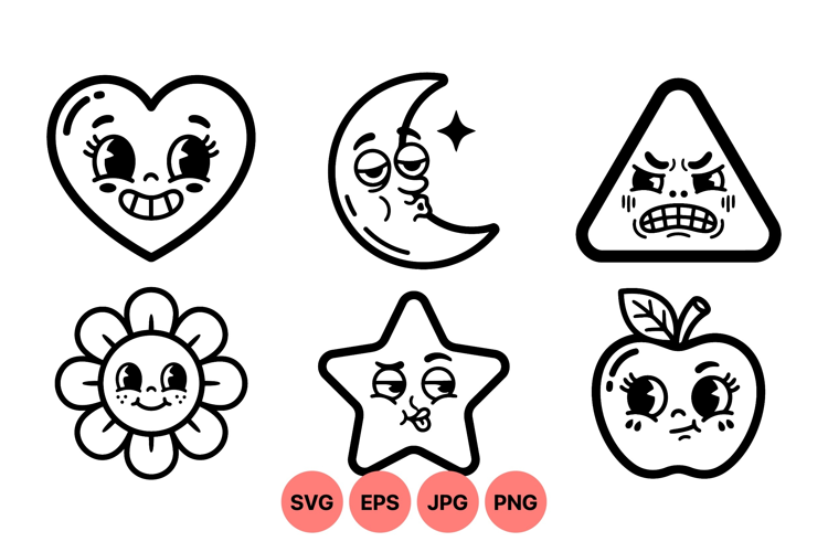 A of black and white vector icons featuring emotive faces on various shapes including heart, moon, triangle, flower, star, and apple with diverse expressions in line art style.
