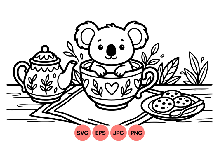 A charming black and white line art illustration shows a small koala nestled inside a decorated teacup with a heart and leaves pattern. nearby are a teapot and cookies on a plate creating a cozy tea time scene, appealing for children or nature themes.