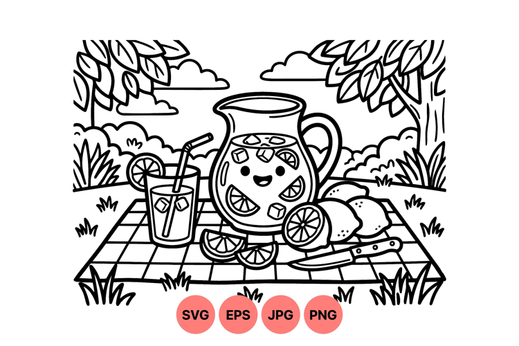 A cheerful pitcher filled with lemon slices and ice cubes sits next to a glass with a straw on a picnic blanket outdoors surrounded by trees and bushes in line art style.