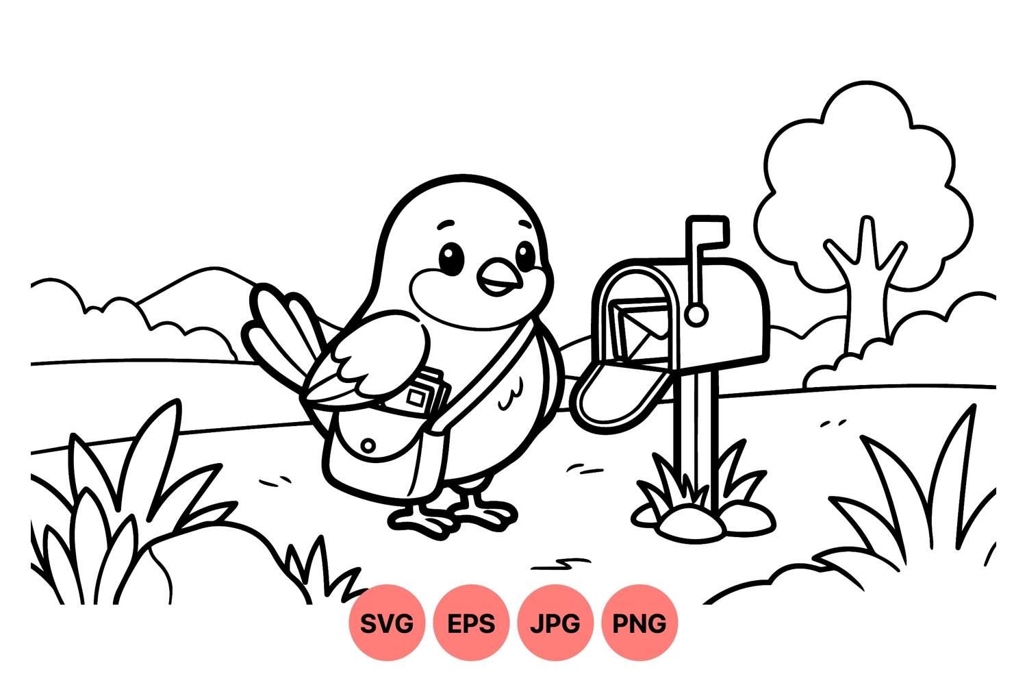 A charming cartoon bird stands next to an open mailbox holding mail in a messenger bag outside in nature near bushes and trees, rendered in simple black line art style.