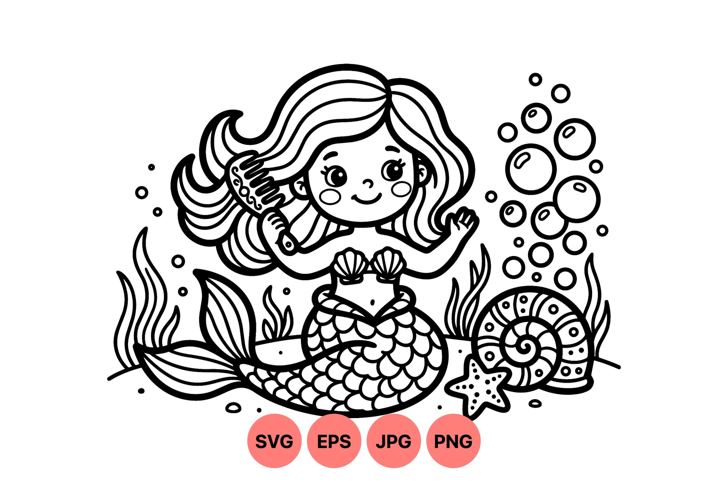 A charming black and white line art vector of a smiling mermaid brushing her hair underwater with seaweed coral bubbles starfish and shell details in a playful style.