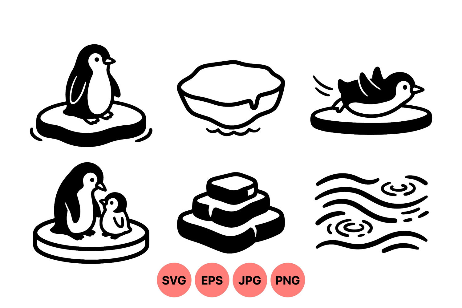 Simple black and white vector illustrations of penguins standing or sliding on ice floes with stylized water waves and stacked ice blocks in a clean minimalist graphic style peaceful mood