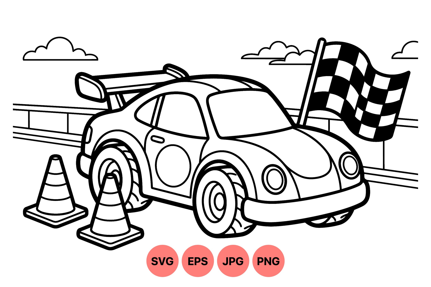 A detailed black and white outline of a racing car featuring a large spoiler with two traffic cones and a waving checkered flag on a racetrack background in simple line art style