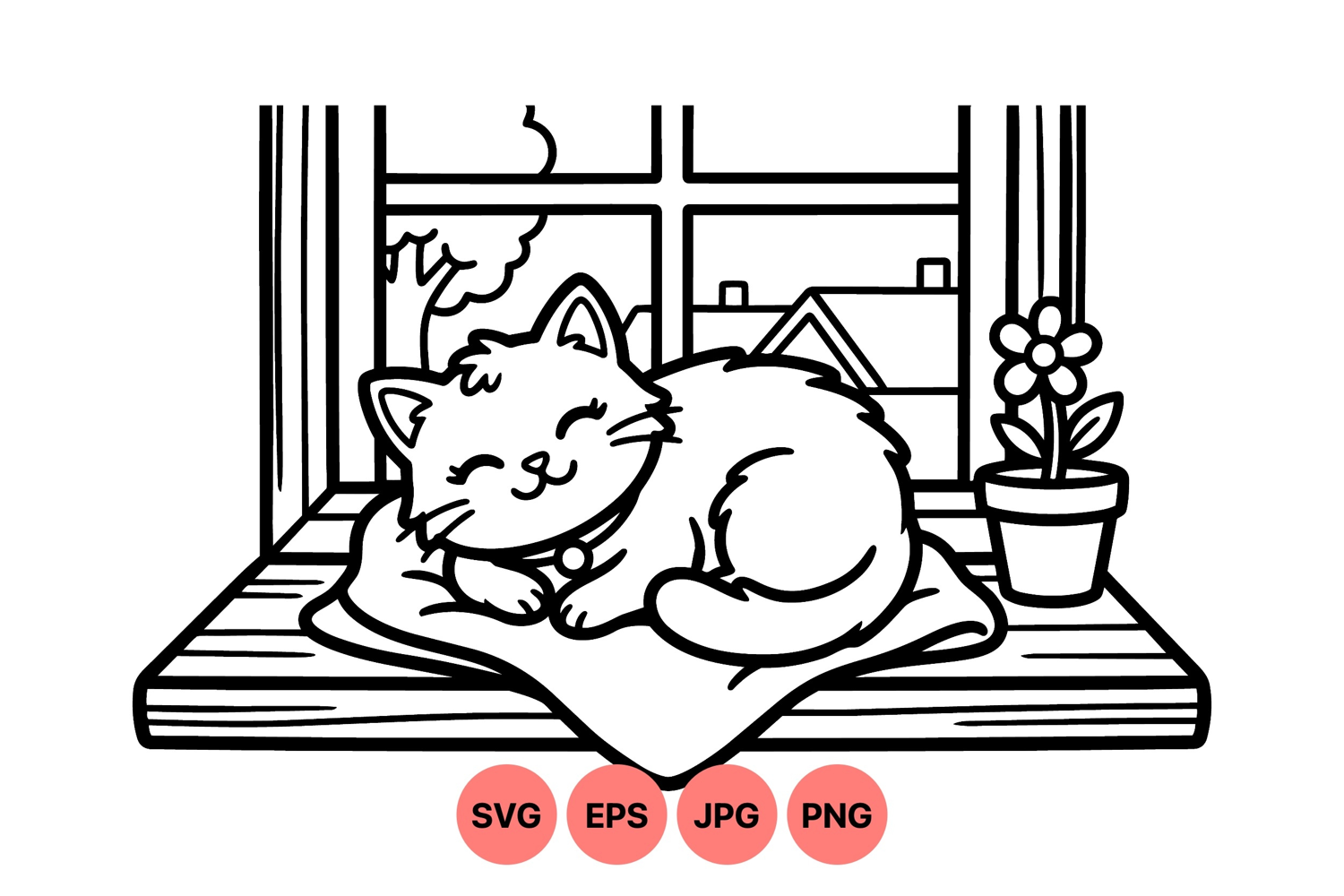 Digital Craft Illustration Animal Clipart Design Cozy Home Design Vector Pet Image Cute Pet Artwork Sleeping Cat Vector Line Art Cat Drawing Cat Resting Graphic Cat Window Illustration Cat On Pillow Art
