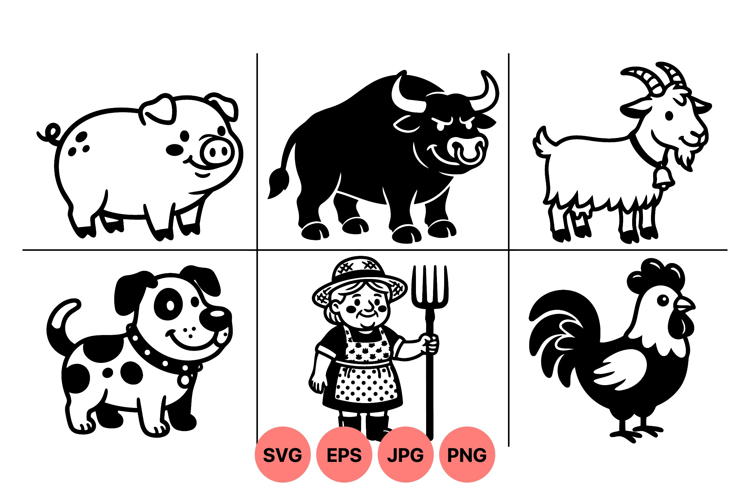 A charming black and white vector illustration featuring farm animals including pig, bull, goat, dog, rooster and a smiling farmer woman holding a pitchfork in simple line art style peaceful rustic mood