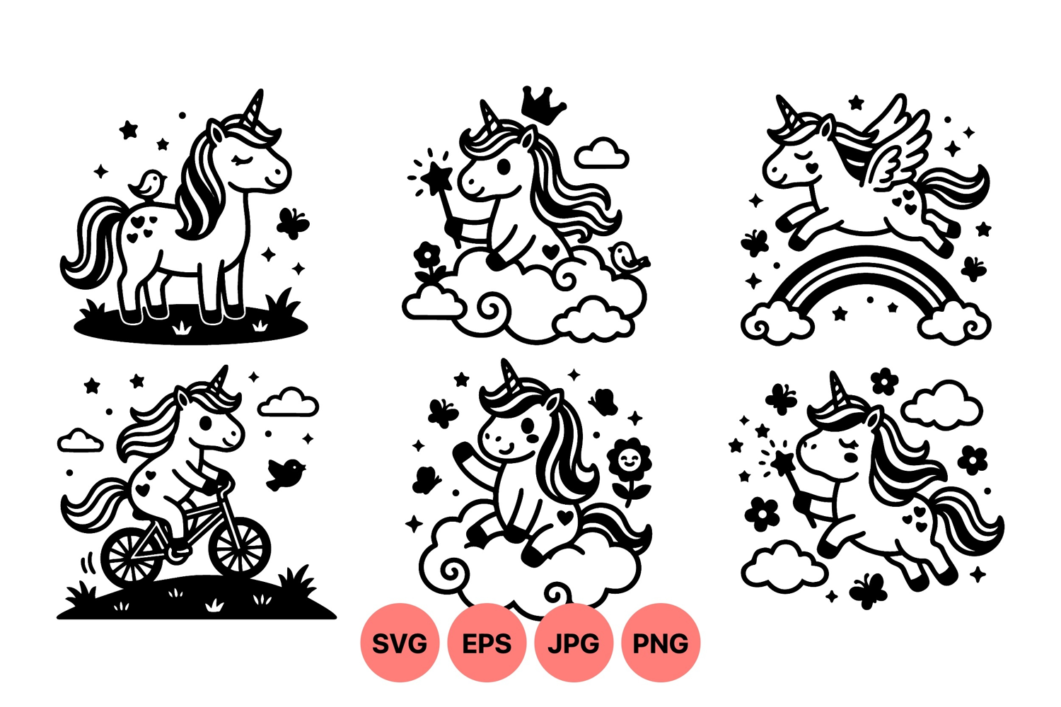 Whimsical black and white vector illustrations showing unicorns in various playful poses with magical elements stars rainbow and clouds creating a charming fantasy mood