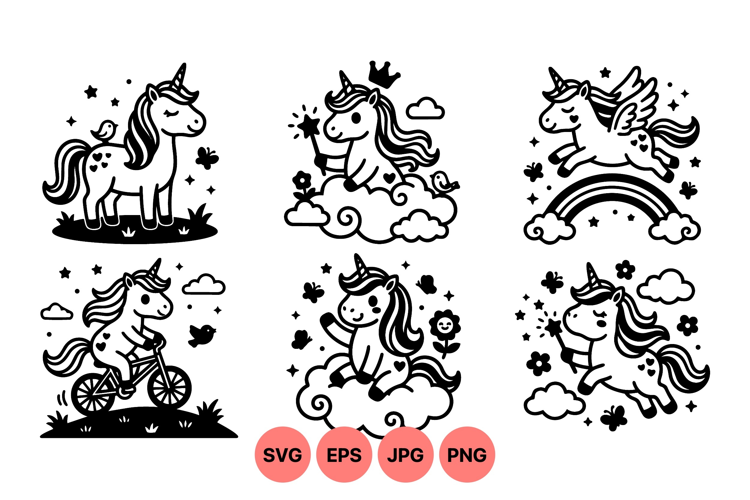 Cute Unicorn Clipart Whimsical Unicorn Drawing Fantasy Animal Art Storybook Animal Art Children Illustration Art Magic Cartoon Design Unicorn Riding Bicycle Basic Black Lineart Fantasy Creature Graphics Playful Vector Illustrations