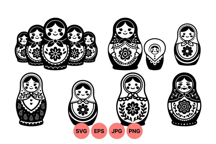 A of black and white vector russian nesting dolls featuring distinct floral decorations and simple smiling faces, shown individually and grouped, creating a classic folk art vibe.