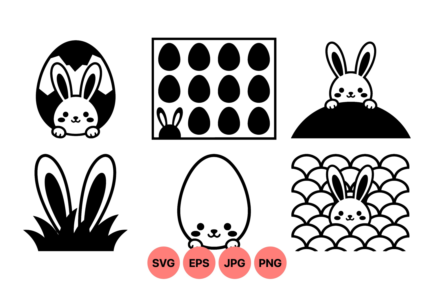 Simple black and white vector icons of cute bunny peeking from cracked eggs and grass with multiple black eggs arranged in grid pattern, playful easter holiday themed illustrations for seasonal design.