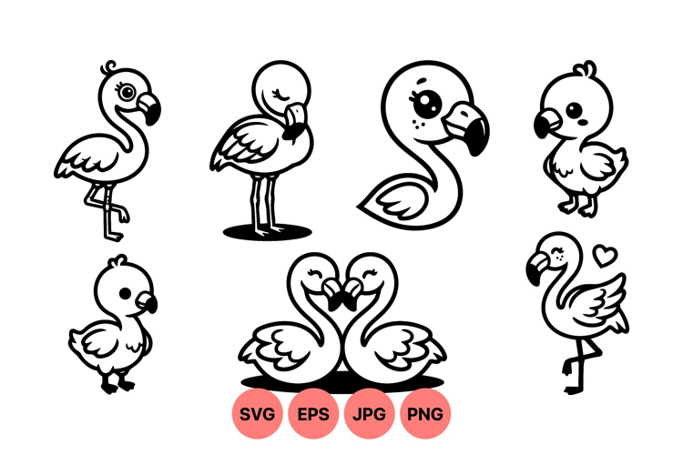 A of adorable cartoon flamingos in black and white line art showing different poses and expressions including love and standing balanced on one leg playful and charming style