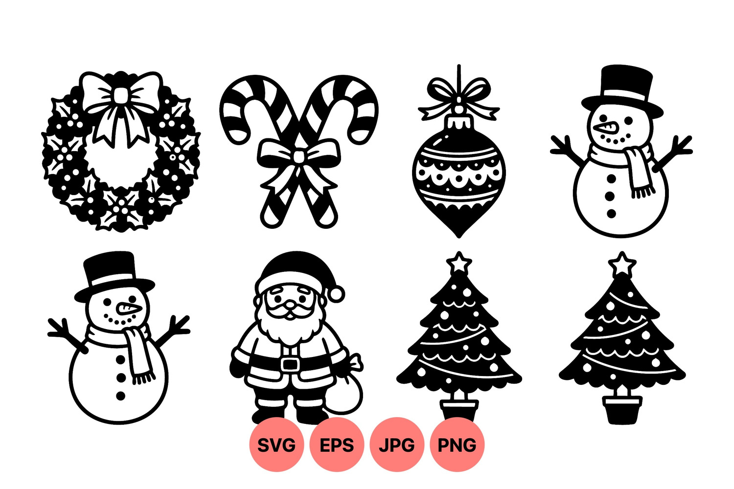 A of black and white flat style vectors featuring classic christmas symbols including wreath, candy canes, hanging ornament, snowman, santa claus, and decorated christmas trees with festive mood.