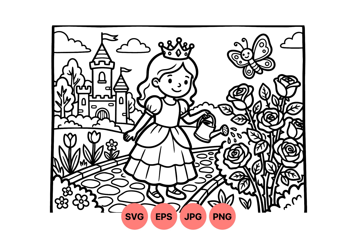 A charming line art shows a princess wearing a crown watering roses on a stone pathway with a butterfly fluttering nearby and a castle in the background peaceful garden scene.