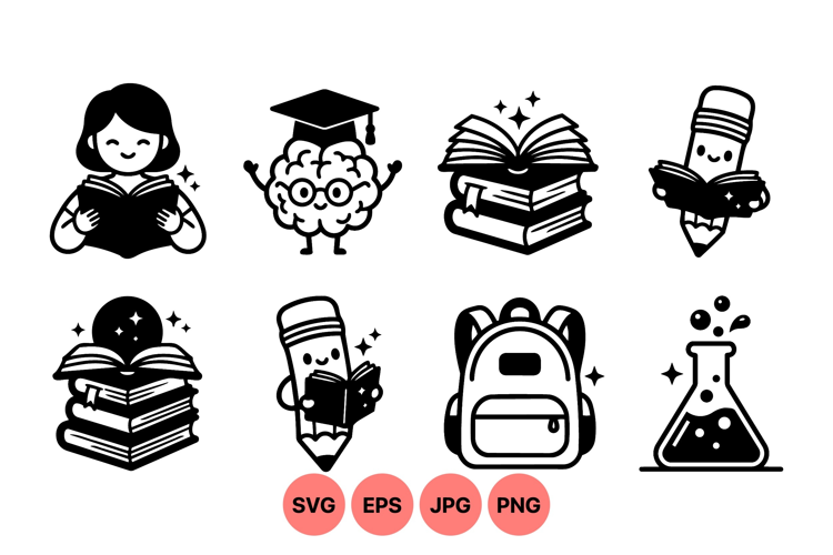 A of cute black and white vector icons features a smiling girl reading a book a brain with graduation cap glasses playful book stacks and school supplies with sparkling highlights educational and friendly style