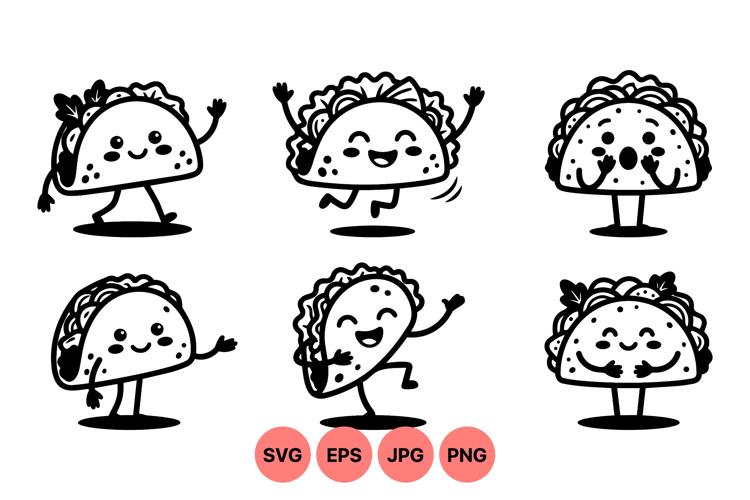 Black and white vector illustration of six cute tacos showing different emotions and movements with smiling faces and animated gestures ideal for food design and playful branding projects
