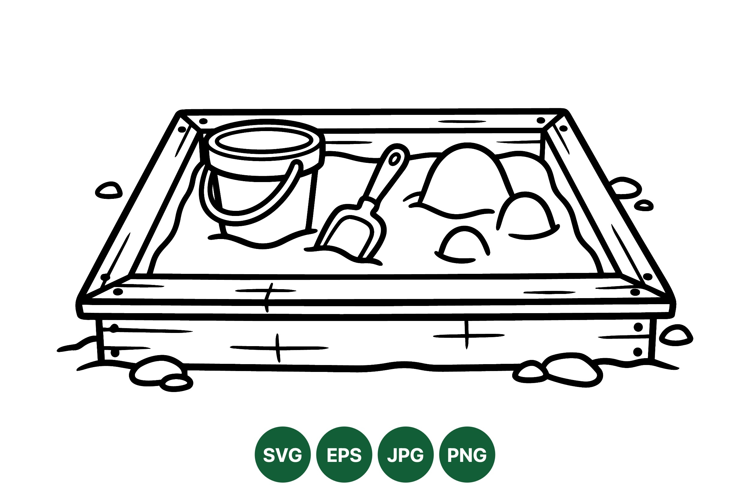 A black and white line drawing showcases a sandbox containing a bucket shovel and sand mounds representing playful outdoor activities for children in a minimalistic style.
