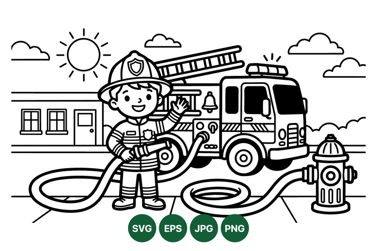A cheerful firefighter dressed in uniform holds a hose connected to a fire hydrant beside a fire truck in a sunny outdoor residential setting depicted in clean black and white line art style.