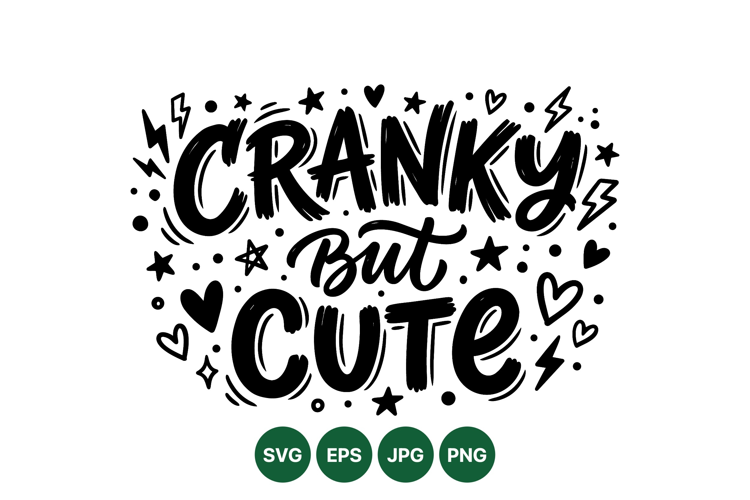 Bold black and white hand lettering artwork saying cranky but cute surrounded by decorative stars hearts dots and lightning bolt shapes in vector style with playful mood