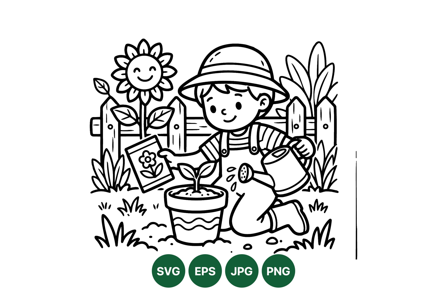 A charming vector illustration shows a boy wearing a hat and overalls watering a young plant near a smiling sunflower and wooden fence in a cheerful garden environment peaceful mood