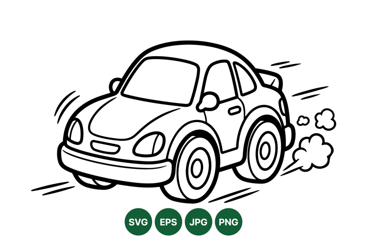 A playful cartoon car is shown speeding with motion lines and smoke puffs behind the wheels in a simple black and white vector style conveying energy and movement.