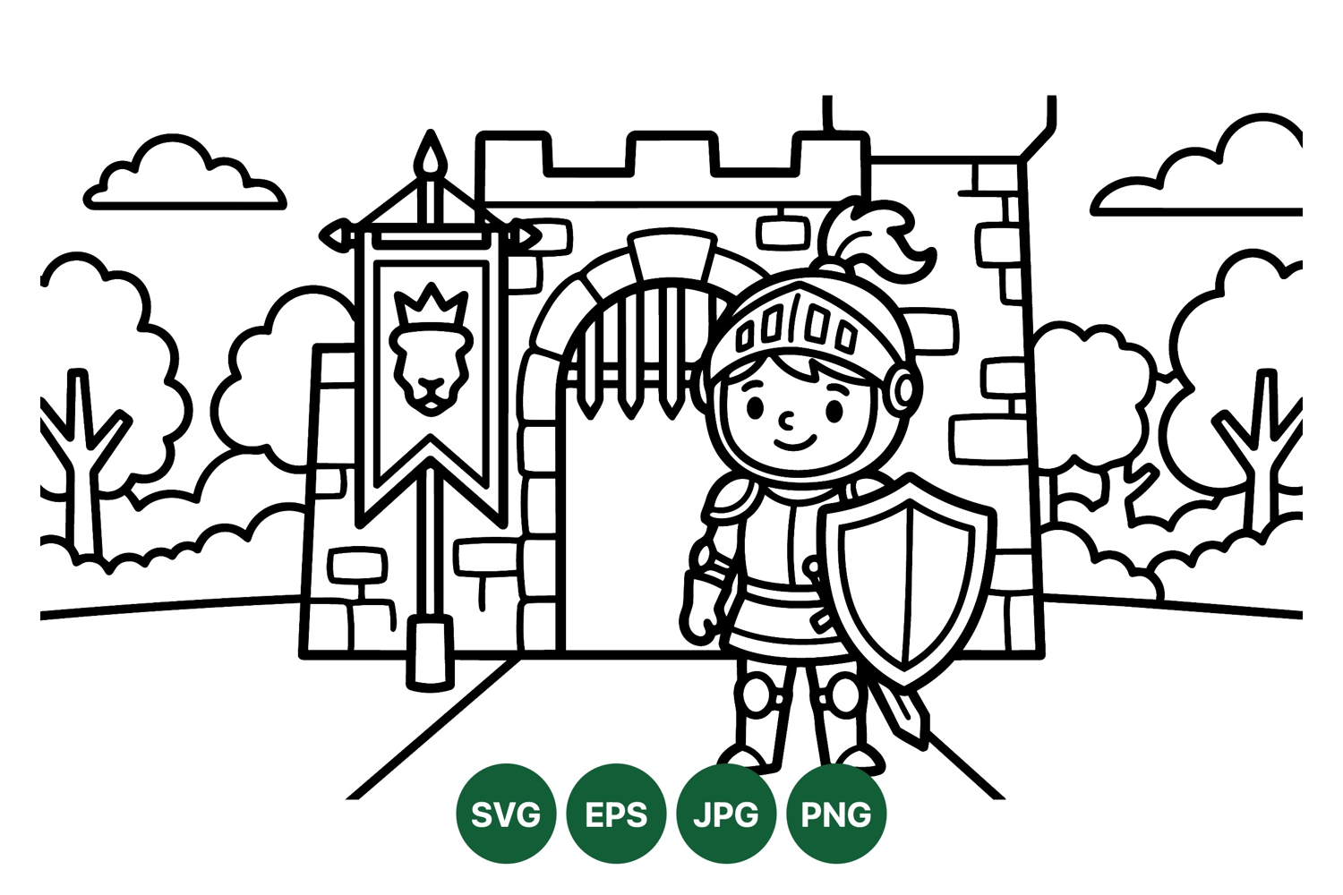 A black and white line art illustration showing a cheerful knight with full armor and shield standing before a medieval castle gate decorated with a lion banner and trees in the background peaceful and simple style