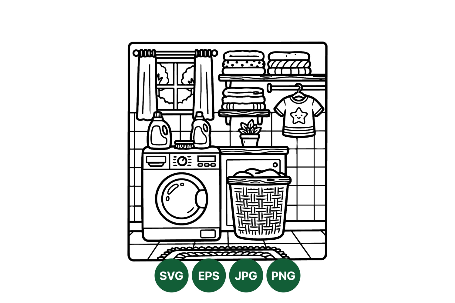 A detailed black and white line art vector shows a laundry room with washing machine, laundry basket, stacked towels, hanging shirt, potted plant, and window revealing trees outside interior scene.