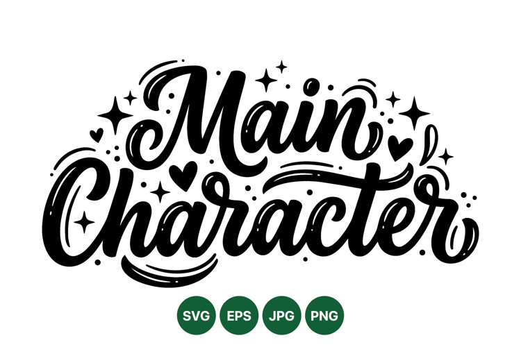 Hand lettering of the phrase main character with elegant cursive script style embellished with hearts and sparkling star icons in black vector format minimal design peaceful