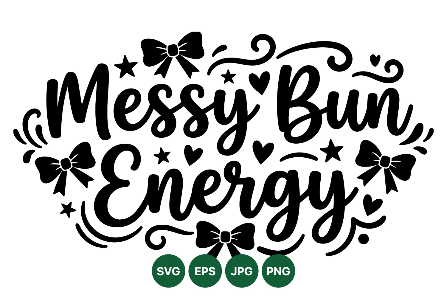 A fun black hand lettering design of the phrase messy bun energy surrounded by playful stars hearts bows and swirls suitable for apparel prints and social media graphics vibrant and stylish